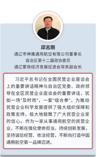 通遼市神鷹通用航空有限公司董事長(zhǎng)、自治區(qū)政協(xié)第十二屆委員會(huì)委員邱志剛,作為自治區(qū)企業(yè)家代表應(yīng)邀參加了此次座談會(huì)。會(huì)后,按照自治區(qū)統(tǒng)戰(zhàn)部的統(tǒng)一部署,提交了參加座談會(huì)的收獲與感受,表示:一定要認(rèn)真貫徹布小林主席講話精神,不斷在強(qiáng)化使命擔(dān)當(dāng),持續(xù)創(chuàng)新發(fā)展,堅(jiān)持誠信經(jīng)營(yíng)、依法經(jīng)營(yíng)上下功夫,不斷向中國通用航空第一品牌邁進(jìn)。